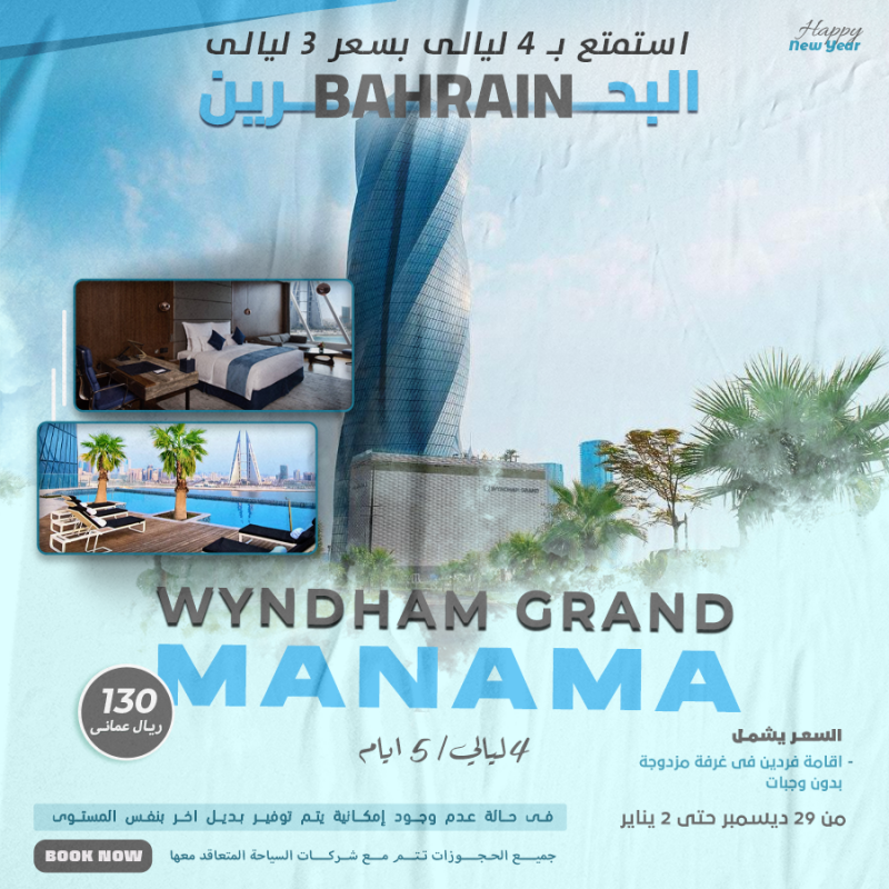 Best Saleاستمتع بالاقامة في البحرين Wyndham Grand Manama السعر يشمل : اقامة فردين في غرفة مزدوجة بدون وجبات من 29 ديسمبر حتي 2 يناير ليالي4 /5أيام