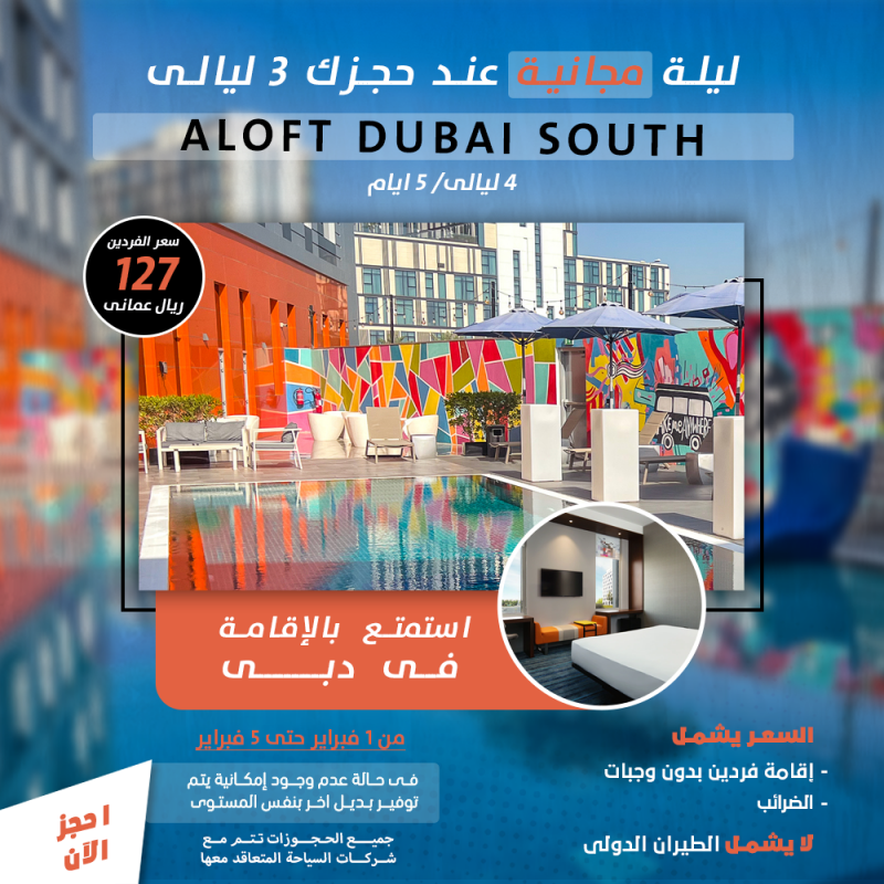 Best Saleاستمع بالاقامة في دبي ALOFT DUBAI SOUTH السعر يشمل إقامة فردين بدون وجبات الضرائب أيام5/4ليالي لا يشمل الطيران الدولي
