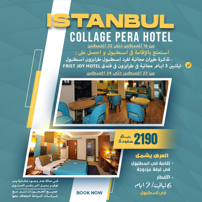 السعر 2190ريال سعودي العرض يشمل إقامة في اسطنبول في غرفة مزدوجه الافطار ليالي7/6ايام