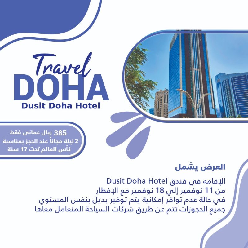 السعر 385 ريال عماني فقط العرض يشمل DUSIT DOHA HOTELالاقامة في فندق من 11 نوفمبر الي 18نوفمبر مع الافطار في حالة عدم توافر إمكانية يتم توفير بديل بنفس المستوي جميع الحجوزات تتم عن طريق شركات السياحة المتعامل معاها