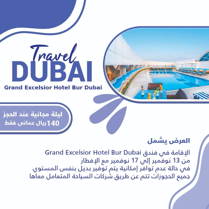 السعر 140 ريال عماني فقط احصل علي ليلة مجانية عند الحجز العرض يشمل Grand Excelsior Hotel Bur Dubai الإقامة في فندق من 13 نوفمبر الي 17نوفمبر مع الافطار في حالة عدم توافر إمكانية يتم توفير بديل بنفس المستوي جميع الحجوزات تتم عن طريق شركات السياحة المتعامل معاها