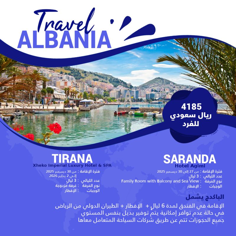السعر 4185 ريال سعودي للفرد SARANDA Hotel Agimi فترة الإقامة : من 27 إلى 30 ديسمبر 2025 عدد الليالي : 3 ليال Family Room with Balcony and Sea View : نوع الغرفة الوجبات الإفطار TIRANA Xheko Imperial Luxury Hotel & SPA 2026 فترة الإقامة : من 30 ديسمبر 2025 إلى 2 يناير عدد الليالي : […]