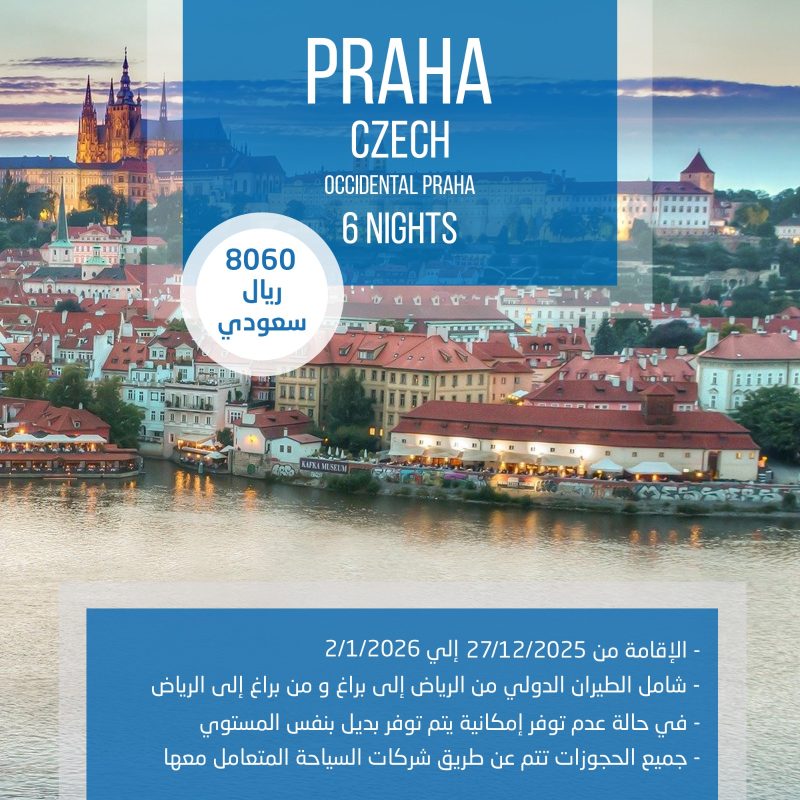 السعر 8060 ريال سعودي 2/1/2026 الإقامة من 27/12/2025 إلى شامل الطيران الدولي من الرياض إلى براغ و من الرياض إلى الرياض في حالة عدم توفر إمكانية يتم توفر بديل بنفس المستوي جميع الحجوزات تتم عن طريق شركات السياحة المتعامل معها