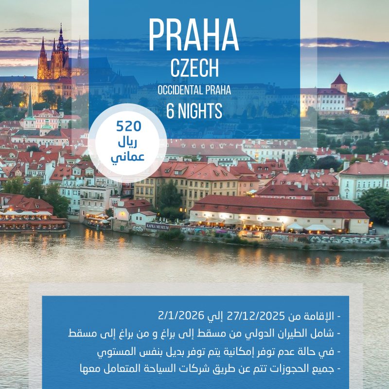 السعر 520 ريال عمانى 2/1/2026 الإقامة من 27/12/2025 إلى شامل الطيران الدولي من مسقط إلى براغ و من براغ إلى مسقط في حالة عدم توفر إمكانية يتم توفر بديل بنفس المستوي جميع الحجوزات تتم عن طريق شركات السياحة المتعامل معها