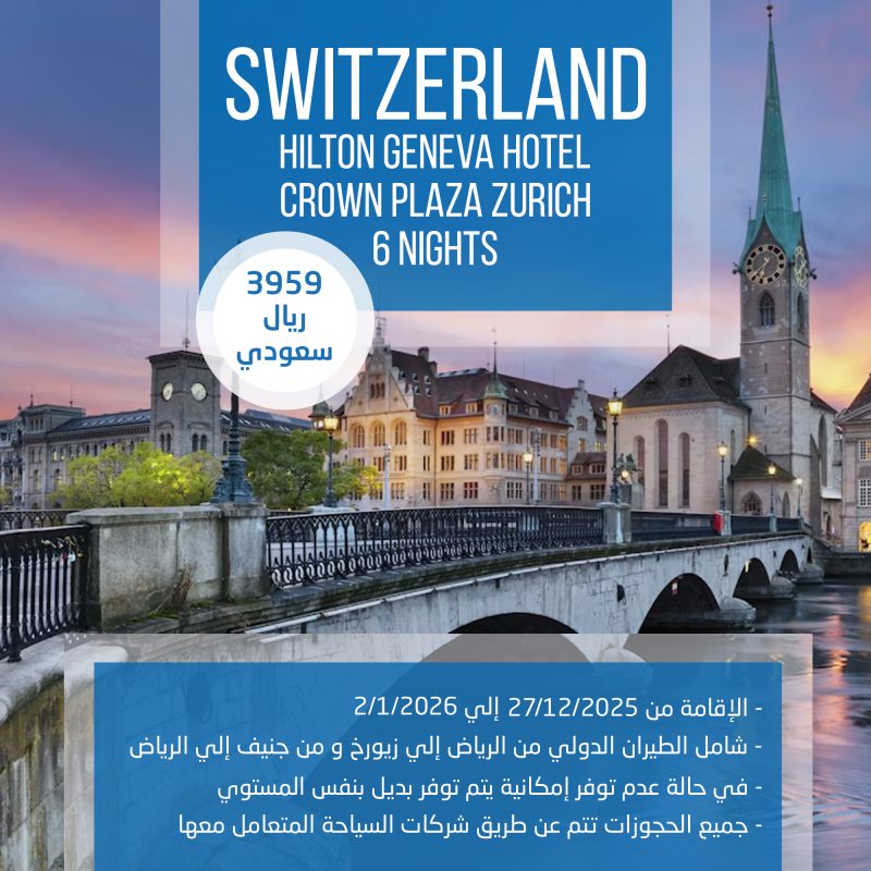 السعر 3959 ريال سعودى 2/1/2026 الإقامة من 27/12/2025 إلى شامل الطيران الدولي من الرياض إلي زيورخ و من جنيف إلي الرياض في حالة عدم توفر إمكانية يتم توفر بديل بنفس المستوي جميع الحجوزات تتم عن طريق شركات السياحة المتعامل معها