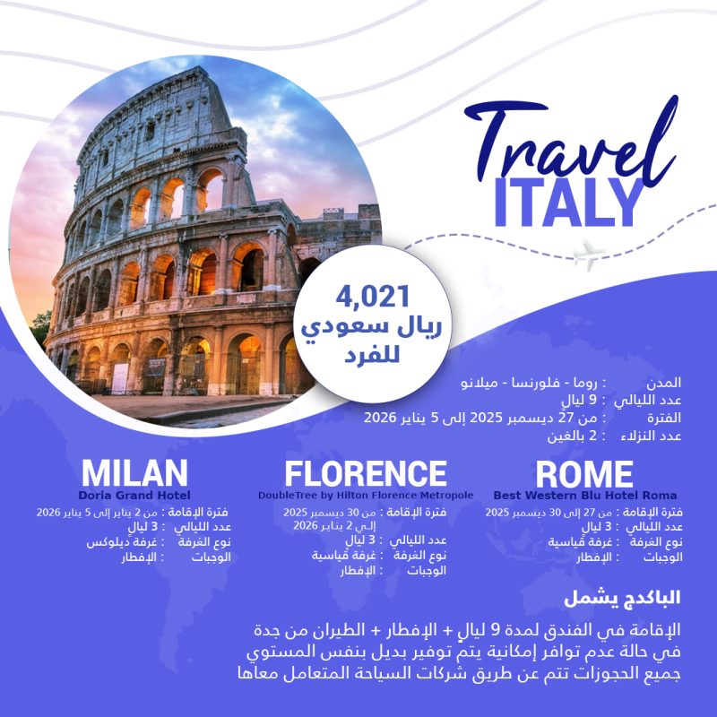 السعر 4,021ريال سعودي للفرد المدن: روما – فلورنسا – ميلانو عدد الليالي : 9 ليال 2026الفترة : من 27 ديسمبر 2025 إلى 5 يناير عدد النزلاء : 2 بالغين MILAN Doria Grand Hotel 2026 فترة الإقامة : من 2 يناير إلى 5 يناير عدد الليالي : 3 ليال نوع الغرفة : غرفة ديلوكس الوجبات:الإفطار FLORENCE […]