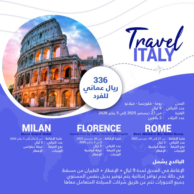 السعر 336 ريال عماني للفرد المدن: روما – فلورنسا – ميلانو عدد الليالي : 9 ليال 2026الفترة : من 27 ديسمبر 2025 إلى 5 يناير عدد النزلاء : 2 بالغين MILAN Doria Grand Hotel فترة الإقامة : من 2 يناير إلى 5 يناير 2026 عدد الليالي : 3 ليال نوع الغرفة : غرفة ديلوكس الوجبات:الإفطار […]