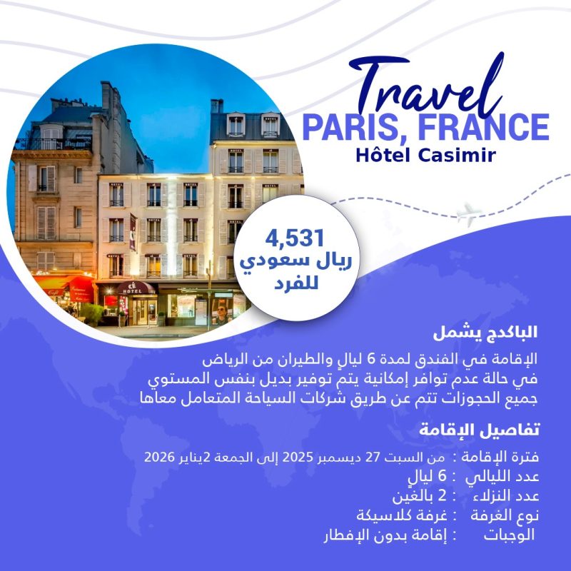 السعر 4,531 ريال سعودي للفرد الباكدج يشمل الإقامة في الفندق لمدة 6 ليال والطيران من الرياض في حالة عدم توافر إمكانية يتم توفير بديل بنفس المستوي جميع الحجوزات تتم عن طريق شركات السياحة المتعامل معاها تفاصيل الإقامة فترة الإقامة : من السبت 27 ديسمبر 2025 إلى الجمعة 2 يناير 2026 عدد الليالي : 6 ليال […]