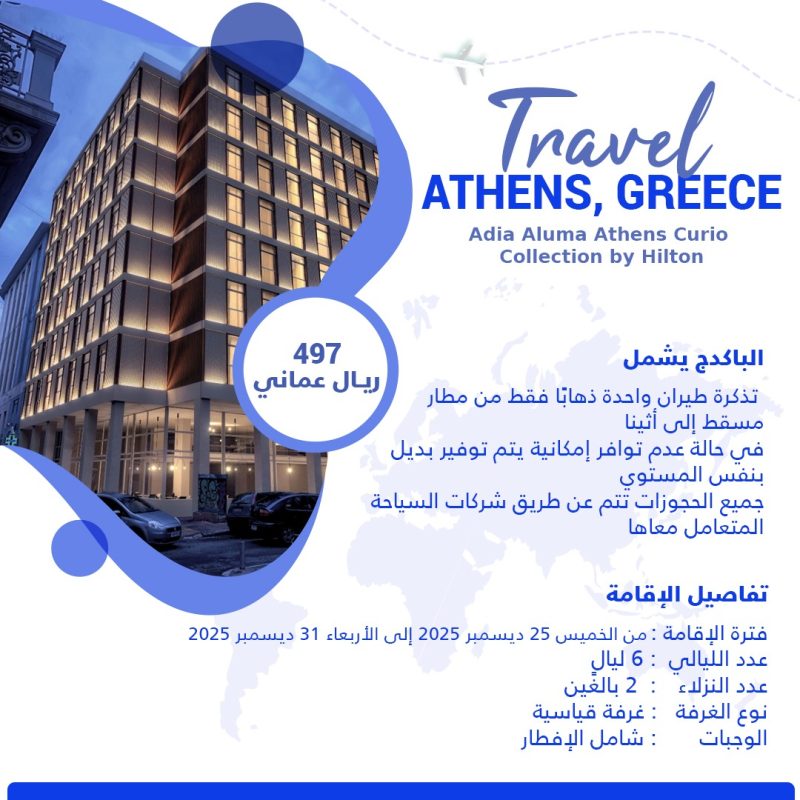 السعر 497 ريال عماني الباكدج يشمل تذكرة طيران واحدة ذهابا فقط من مطار مسقط الى أثينا في حالة عدم توافر إمكانية يتم توفير بديل بنفس المستوي جميع الحجوزات تتم عن طريق شركات السياحة المتعامل معاها تفاصيل الإقامة فترة الإقامة : من الخميس 25 ديسمبر 2025 إلى الأربعاء 31 ديسمبر 2025 عدد الليالي : 6 ليال […]