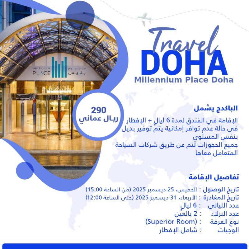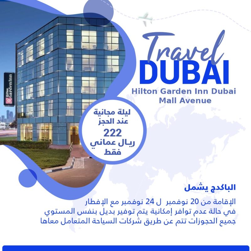 ليلة مجانية خصم عند الحجز 375 ريال عماني فقط الباكدج يشمل الإقامة من 27 نوفمبر الي 1 ديسمبر مع الإفطار في حالة عدم توافر إمكانية يتم توفير بديل بنفس المستوي جميع الحجوزات تتم عن طريق شركات السياحة المتعامل معاها تفاصيل الإقامة