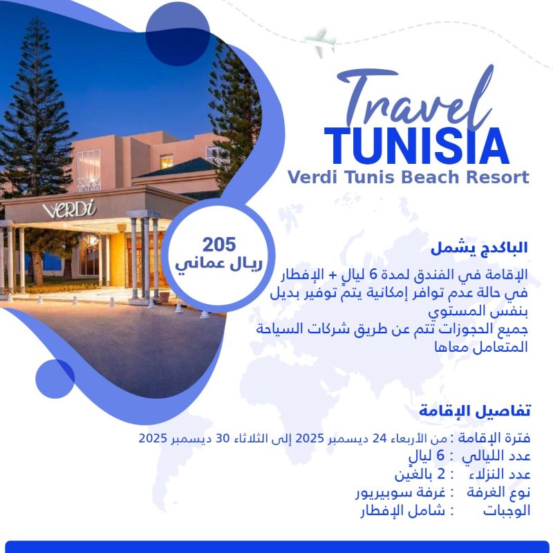 السعر 205 ريال عماني الإقامة في الفندق لمدة 6 ليال + الإفطار في حالة عدم توافر إمكانية يتم توفير بديل بنفس المستوي جميع الحجوزات تتم عن طريق شركات السياحة المتعامل معاها تفاصيل الإقامة فترة الإقامة : من الأربعاء 24 ديسمبر 2025 إلى الثلاثاء 30 ديسمبر 2025 عدد الليالي : 6 ليال عدد النزلاء : 2 […]