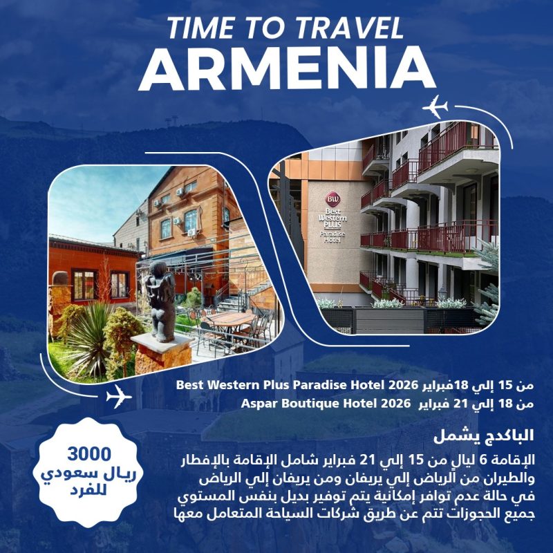 السعر 3000 ريال سعودي للفرد الباكدج يشمل الإقامة 6 ليال من 15 إلي 21 فبراير شامل الإقامة بالإفطار والطيران من الرياض إلي يريفان ومن يريفان إلي الرياض في حالة عدم توافر إمكانية يتم توفير بديل بنفس المستوي جميع الحجوزات تتم عن طريق شركات السياحة المتعامل معها
