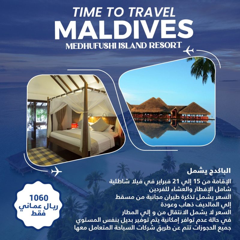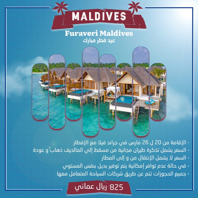 السعر 825 ريال عماني الإقامة من 20 ل 26 مارس في جراند فيلا مع الإفطار السعر يشمل تذكرة طيران مجانية من مسقط إلى المالديف ذهاب و عودة السعر لا يشمل الإنتقال من و إلى المطار في حالة عدم توافر إمكانية يتم توفير بديل بنفس المستوي جميع الحجوزات تتم عن طريق شركات السياحة المتعامل معها