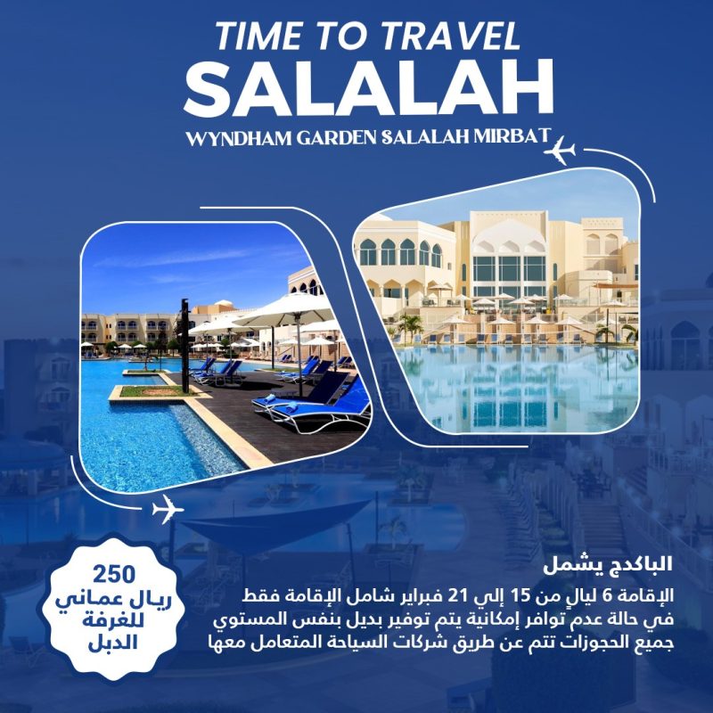 السعر 250 ريال عماني للغرفة الدبل الباكدج يشمل الإقامة 6 ليال من 15 إلي 21 فبراير شامل الإقامة فقط في حالة عدم توافر إمكانية يتم توفير بديل بنفس المستوي جميع الحجوزات تتم عن طريق شركات السياحة المتعامل معها