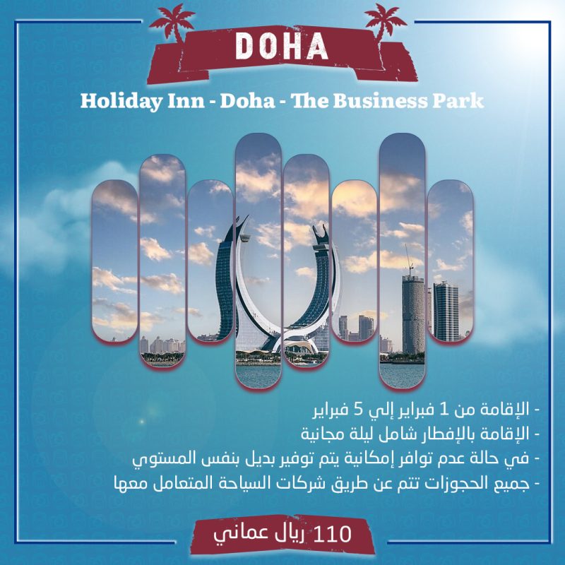 السعر 110 ريال عماني الإقامة من 1 فبراير إلي 5 فبراير الإقامة بالإفطار شامل ليلة مجانية في حالة عدم توافر إمكانية يتم توفير بديل بنفس المستوي جميع الحجوزات تتم عن طريق شركات السياحة المتعامل معها