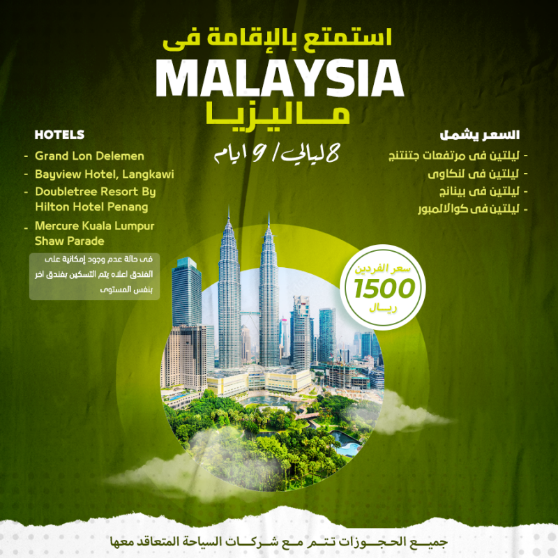 سعر الفردين 1500ريال :السعر يشمل ليلتين في مرتفعات جتنتنج ليلتين في لنكاوي ليلتين في بينانج ليلتين في كوالالمبور