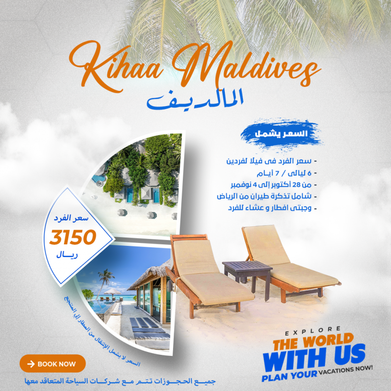 time to see maladives السعر يشمل : سعر الفردين في جاردن فيلا مع الافطار ليالي6 /7 ايام من 16 نوفمبر الي 22 نوفمبر تذكرة طيران مجانية ذهاب وعودة من جدة