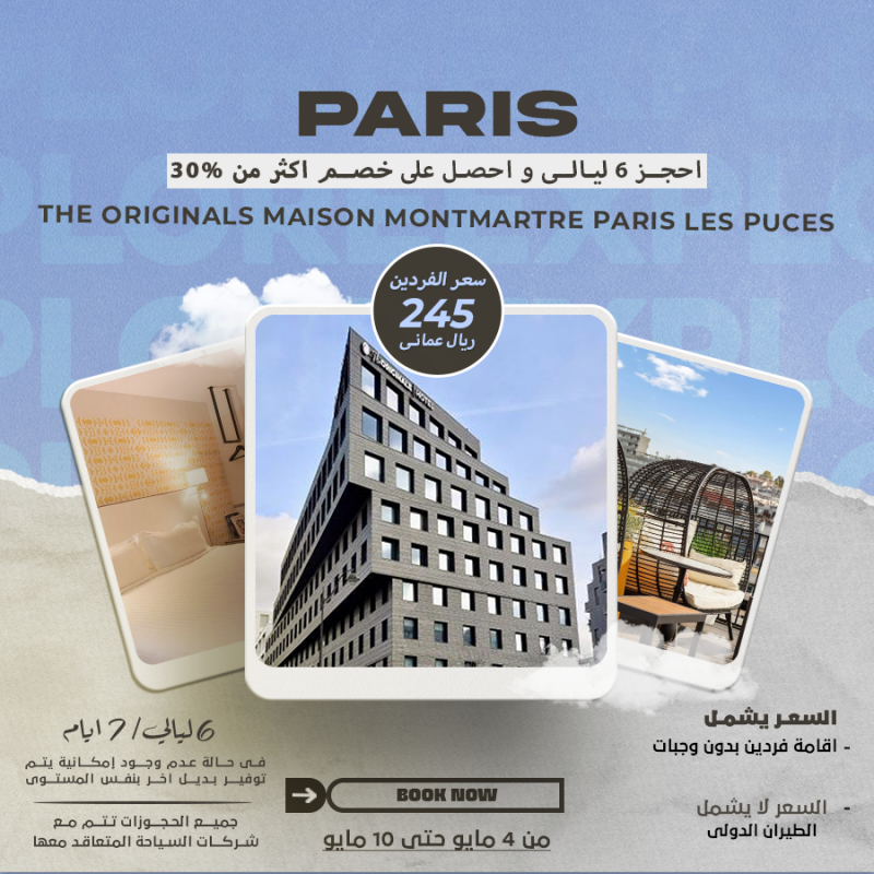احصل علي ليله مجانية عند حجز 3 ليالي سعر الفردين 65 ريال عماني السعر يشمل اقامة فردين في غرفة ألوفت بدون وجبات