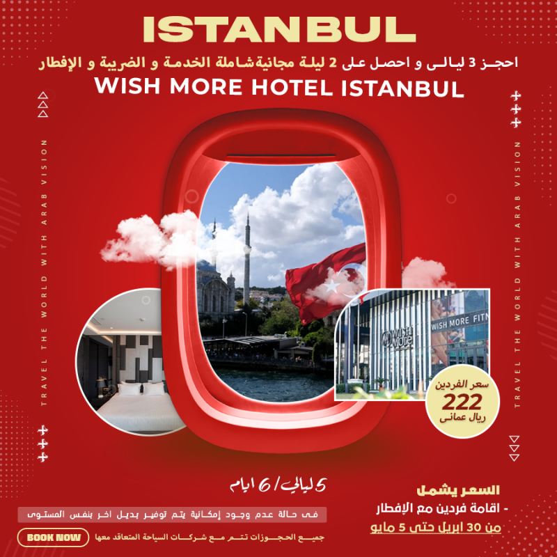 سعر الفرد في فندق 4 نجوم 195 ريال عماني سعر الفرد في فندق 5 نجوم 215 ريال عماني العرض يشمل اقامة 4 ليالي في اسطنبول 4 ليالي طرابزون اقامة في غرفةمزدوجة شامل الافطار الانتقال من الفندق الي المطار والعكس