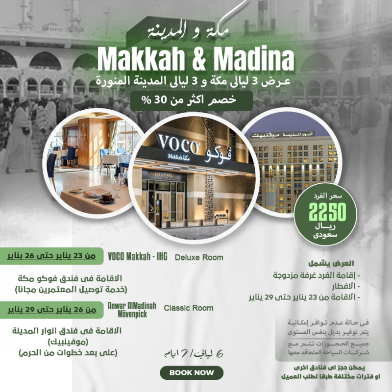 سعر الفرد 2250 ريال سعودي العرض يشمل إقامة الفرد في غرفة مزدوجة الافطار الاقامة من 23 يناير حتي 29 يناير