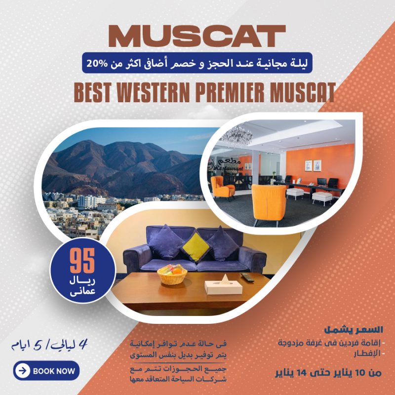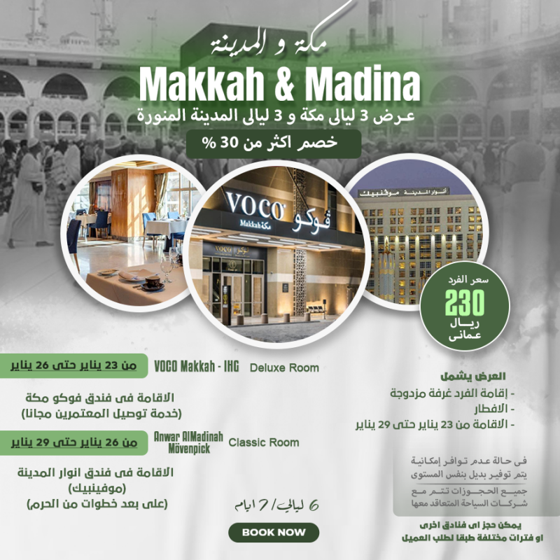 سعر الفرد 230 ريال عماني العرض يشمل إقامة الفرد في غرفة مزدوجة الافطار الاقامة من 23 يناير حتي 29 يناير