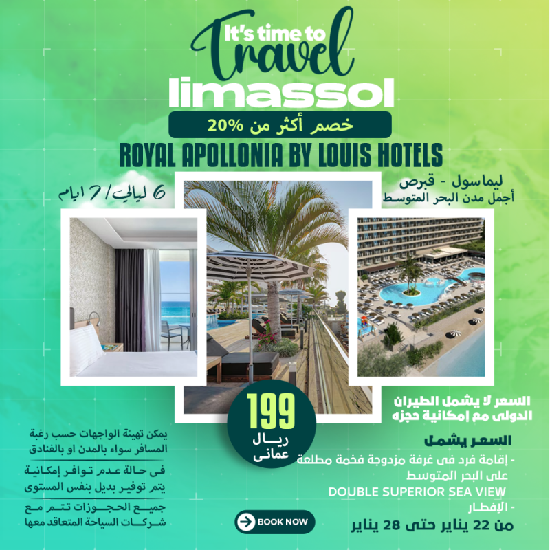 السعر 199ريال عماني السعر يشمل إقامة فرد في غرفة مزدوجة فخمة مطلعة علي البحر المتوسط DOUBLE SUPERIOR SEA VIEW الافطار
