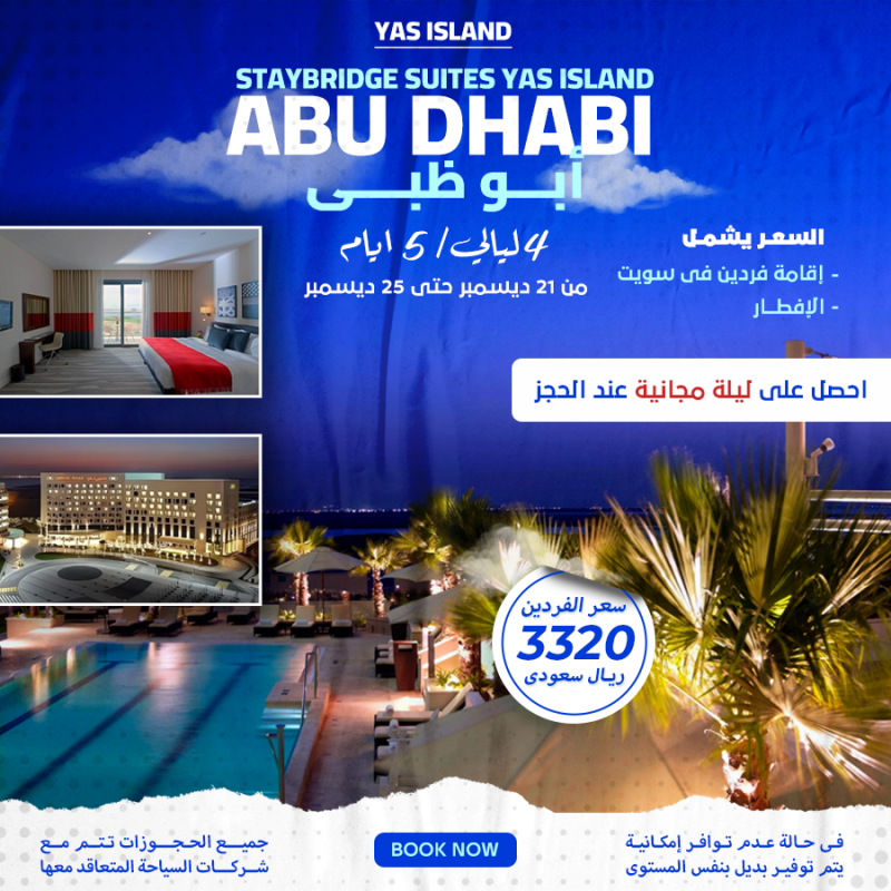 السعر 3320 ريال سعودي السعر يشمل إقامة فردين في سويت الإفطار