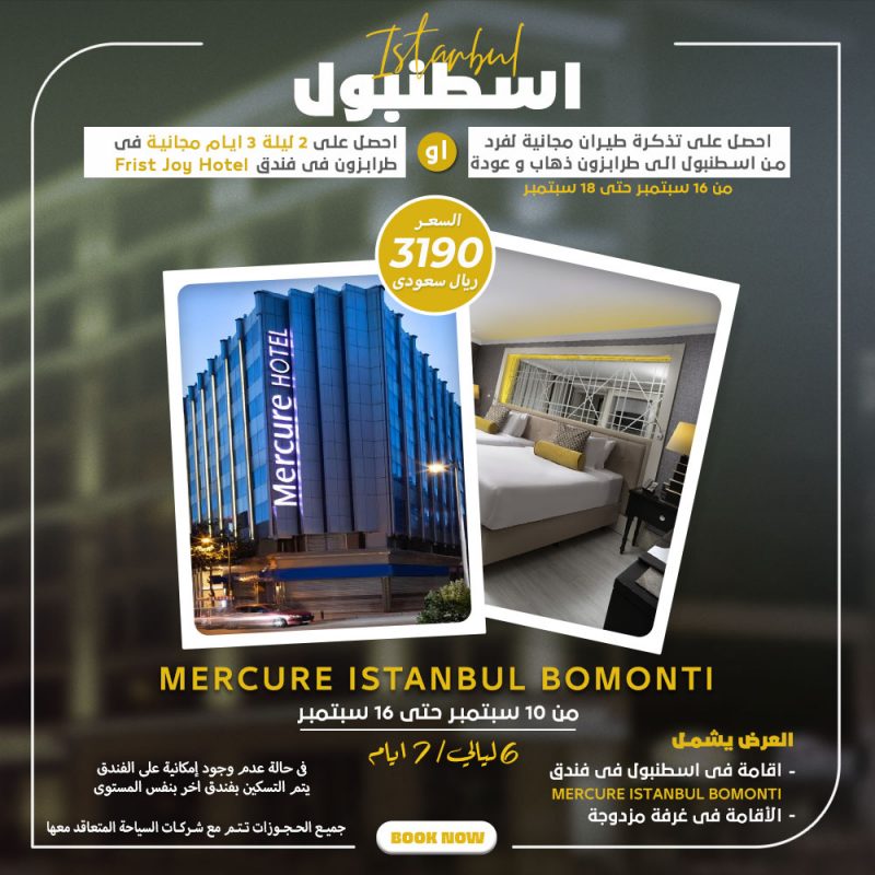 سعر الفردين 3190 ريال سعودي العرض يشمل اقامة في اسطنبول الاقامة في غرفة مزدوجة