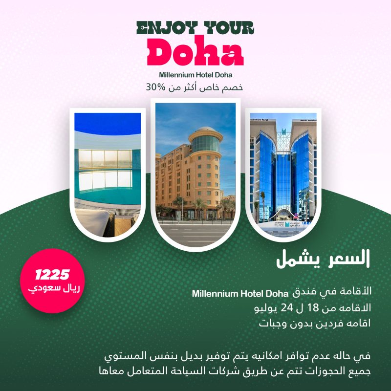 السعر 1225ريال سعودي السعر يشمل Millennium Hotel Dohaالاقامة في فندق الاقامة من 18 ل 24 يوليو اقامة فردين بدون وجبات