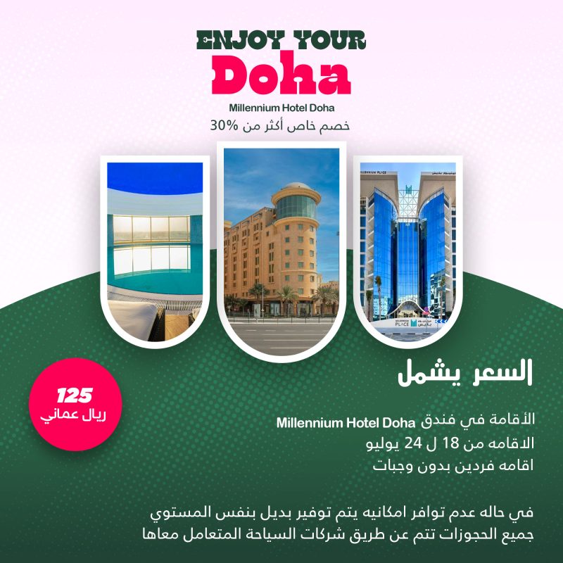 السعر 125 ريال عماني السعر يشمل Millennium Hotel Dohaالاقامة في فندق الاقامة من 18 ل 24 يوليو اقامة فردين بدون وجبات