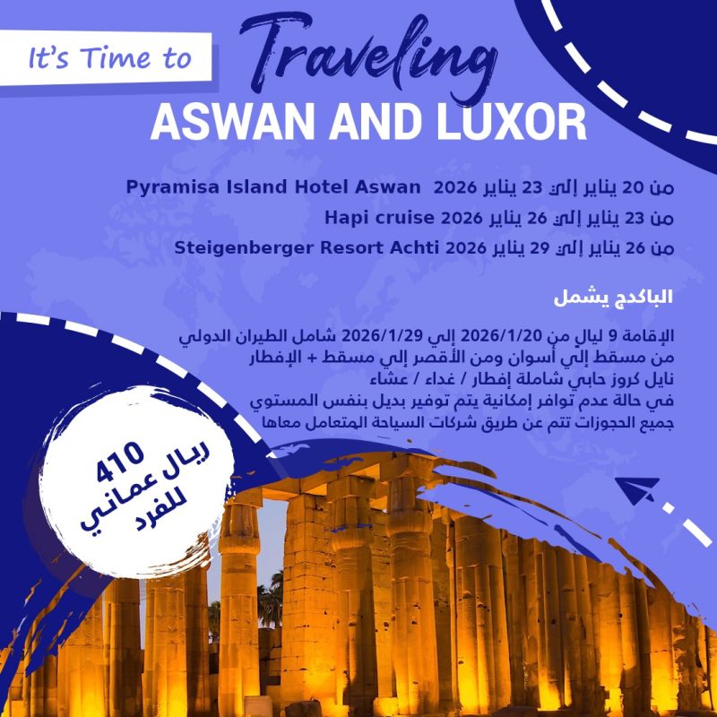 السعر 410 ريال عماني للفرد الباكدج يشمل الإقامة 9 ليال من 2026/1/20 إلي 2026/1/29 شامل الطيران الدولي من مسقط إلي أسوان و من الأقصر إلي مسقط + الإفطار نايل كروز حابي شاملة إفطار / غداء / عشاء في حالة عدم توافر إمكانية يتم توفير بديل بنفس المستوي جميع الحجوزات تتم عن طريق شركات السياحة المتعامل […]