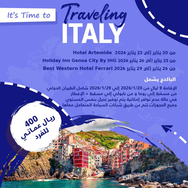 السعر 400 ريال عمانى للفرد الباكدج يشمل الإقامة 9 ليال من 2026/1/20 إلي 2026/1/29 شامل الطيران الدولي من مسقط إلي روما و من نابولي إلي مسقط + الإفطار في حالة عدم توافر إمكانية يتم توفير بديل بنفس المستوي جميع الحجوزات تتم عن طريق شركات السياحة المتعامل معاها