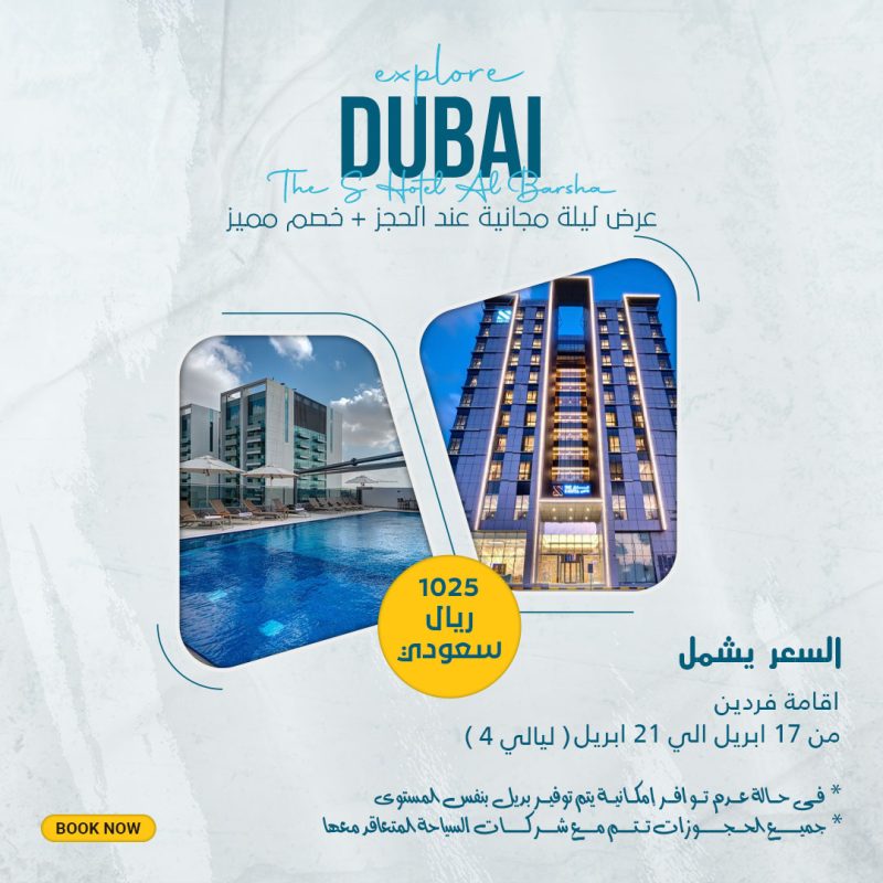 السعر 1025 ريال سعودي السعر يشمل إقامة فردين (من 17 ابريل الي 21 ابريل (4 ليالي