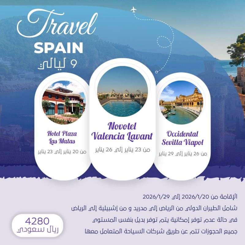 السعر 4280 ريال سعودي 2026/1/29 الإقامة من 2026/1/20 إلى شامل الطيران الدولى من الرياض إلى مدريد و من إشبيلية إلى الرياض في حالة عدم توفر إمكانية يتم توفر بديل بنفس المستوى جميع الحجوزات تتم عن طريق شركات السياحة المتعامل معها