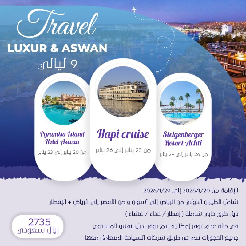 السعر 2735 ريال سعودى 2026/1/29 الإقامة من 2026/1/20 إلى شامل الطيران الدولي من الرياض إلى أسوان و من الأقصر إلى الرياض + الإفطار نايل كروز حابي شاملة ( إفطار / غداء / عشاء ) في حالة عدم توفر إمكانية يتم توفر بديل بنفس المستوى جميع الحجوزات تتم عن طريق شركات السياحة المتعامل معها