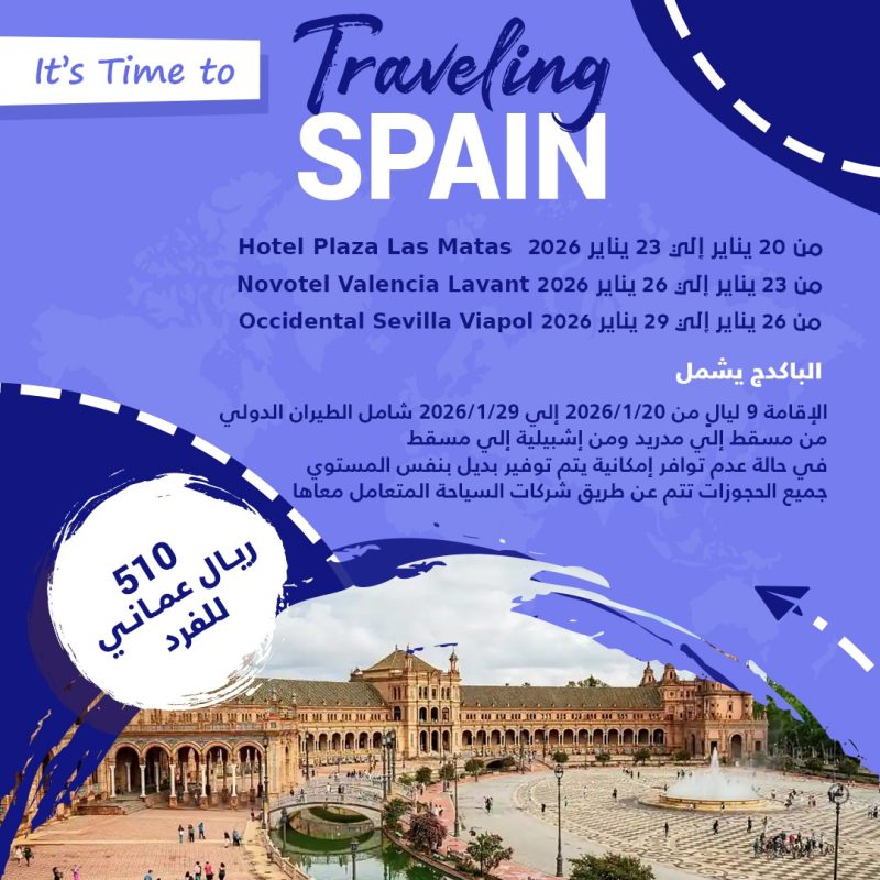 السعر 510 ريال عماني للفرد Hotel Plaza Las Matas 2026 من 20 يناير إلى 23 يناير Novotel Valencia Lavant 2026 من 23 يناير إلى 26 يناير Occidental Sevilla Viapol 2026 من 26 يناير إلى 29 يناير الباكدج يشمل الإقامة 9 ليال من 2026/1/20 إلي 2026/1/29 شامل الطيران الدولي من مسقط إلي مدريد ومن إشبيلية إلى […]