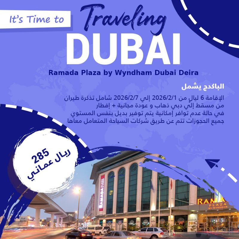 السعر 285 ريال عماني الباكدج يشمل الإقامة 6 ليال من 2026/2/1 إلي 2026/2/7 شامل تذكرة طيران من مسقط إلي دبي ذهاب وعودة مجانية + إفطار في حالة عدم توافر إمكانية يتم توفير بديل بنفس المستوي جميع الحجوزات تتم عن طريق شركات السياحة المتعامل معاها