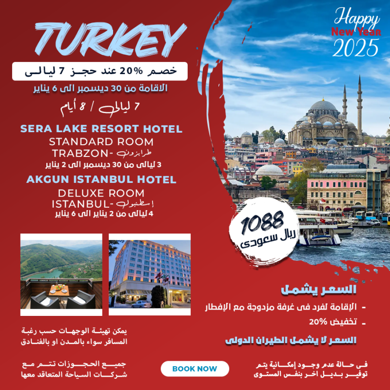 السعر 1088 ريال سعودي السعر يشمل الاقامة لفرد في غرفة مزدوجة مع الافطار تخفيض% 20 السعر لا يشمل الطيران الدولي
