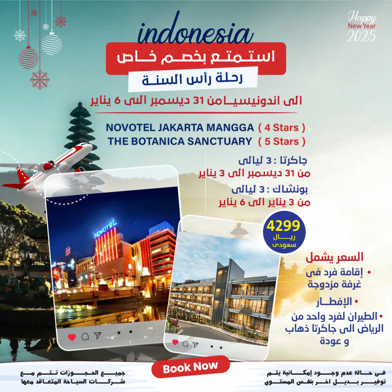 السعر 4299 ريال سعودي السعر يشمل إقامة فرد في غرفة مزدوجة الافطار الطيران لفرد واحد من الرياض الي جاكرتا ذهاب وعودة