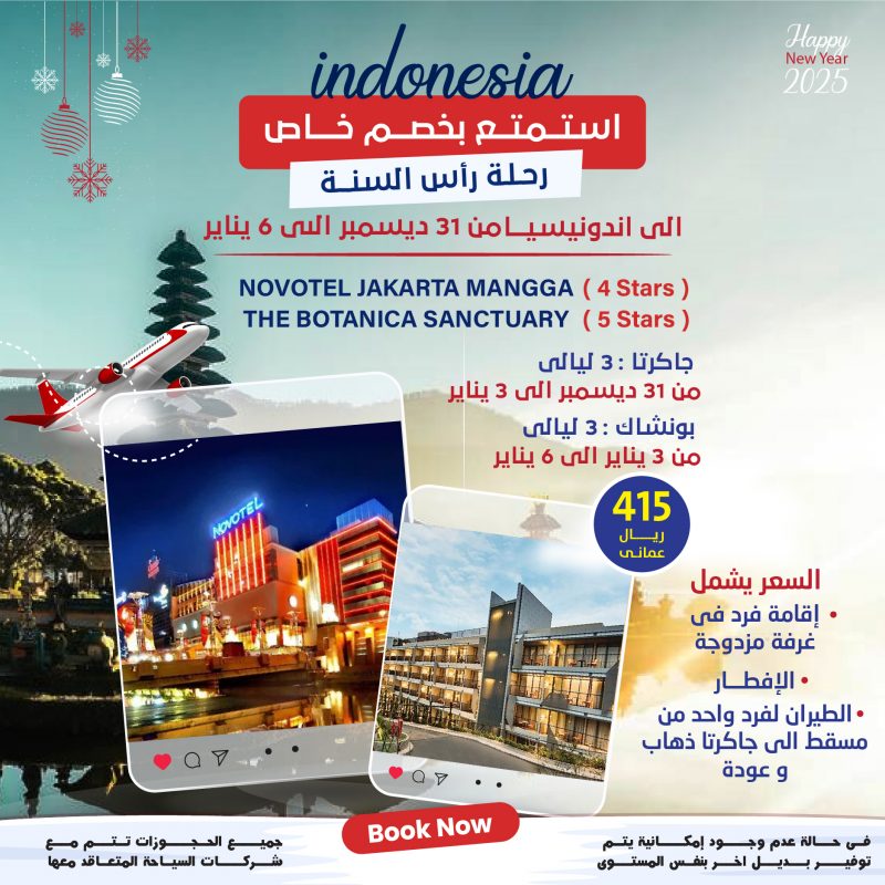 السعر 415ريال عماني السعر يشمل إقامة فرد في غرفة مزدوجة الافطار الطيران لفرد واحد من مسقط الي جاكرتا ذهاب وعودة