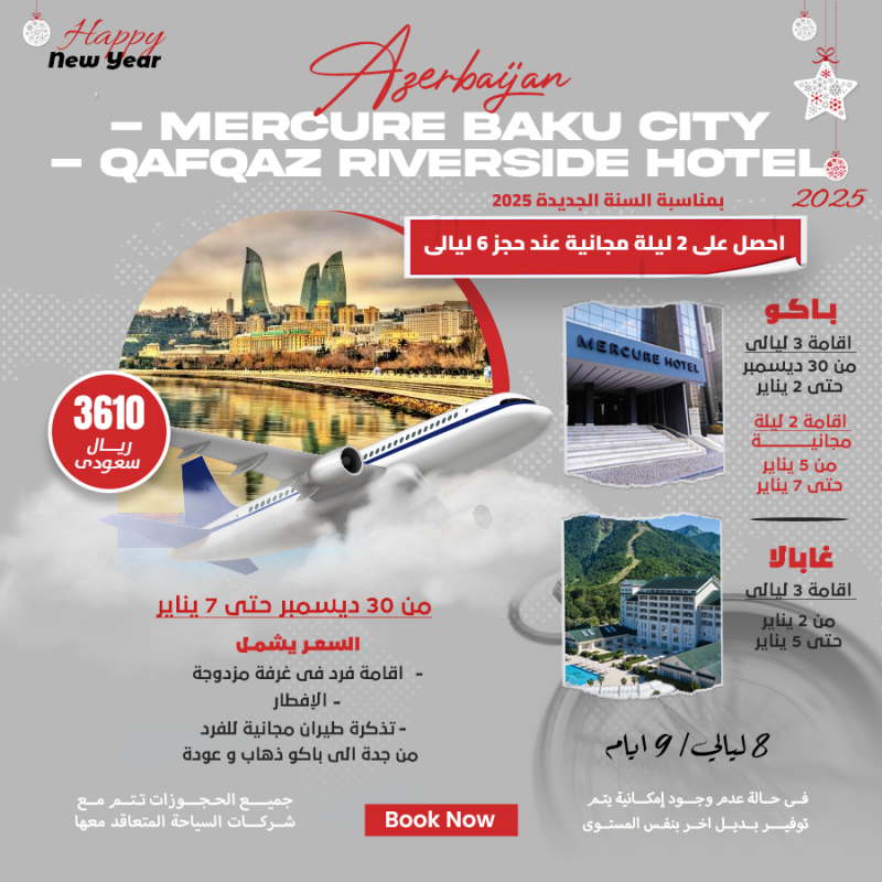 السعر 3610 ريال سعودي السعر يشمل اقامة فرد في غرفة مزدوجة الافطار تذكرة طيران مجانية للفرد من جدة الي باكو ذهاب وعودة