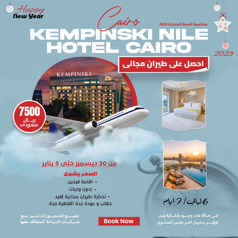 السعر 7500 ريال سعودي السعر يشمل إقامة فردين بدون وجبات تذكرة طيران مجانية لفرد ذهاب وعودة جدة القاهرة جده