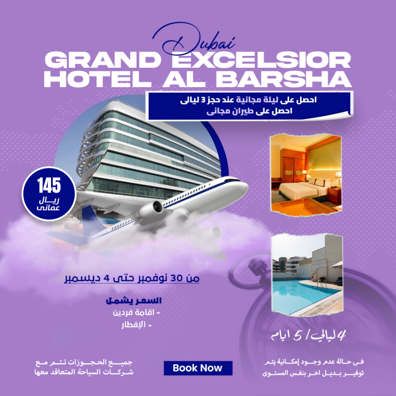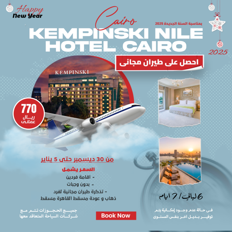 السعر 770 ريال عماني السعر يشمل إقامة فردين بدون وجباتتذكرة طيران مجانية لفرد ذهاب وعودة مسقط القاهرة مسقط