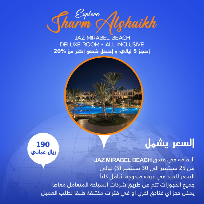 السعر 190 ريال عماني السعر يشمل JAZ MIRABEL BEACH الأقامة في فندق من 25 سبتمبر الي 30 سبتمبر (5) ليالي السعر للفرد في غرفة مزدوجة شامل كلياً جميع الحجوزات تتم عن طريق شركات السياحة المتعامل معاها يمكن حجز اي فنادق اخري او في فترات مختلفة طبقا لطلب العميل