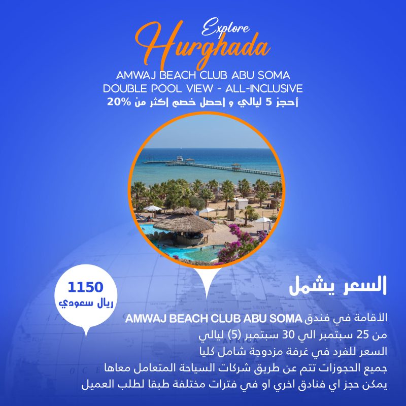 السعر 1150 ريال سعودي السعر يشمل AMWAJ BEACH CLUB ABU SOMA الاقامة في فندق من 25 سبتمبر الي 30 سبتمبر (5) ليالي السعر للفرد في غرفة مزدوجة شامل كليا جميع الحجوزات تتم عن طريق شركات السياحة المتعامل معاها يمكن حجز اي فنادق اخري او في فترات مختلفة طبقا لطلب العميل