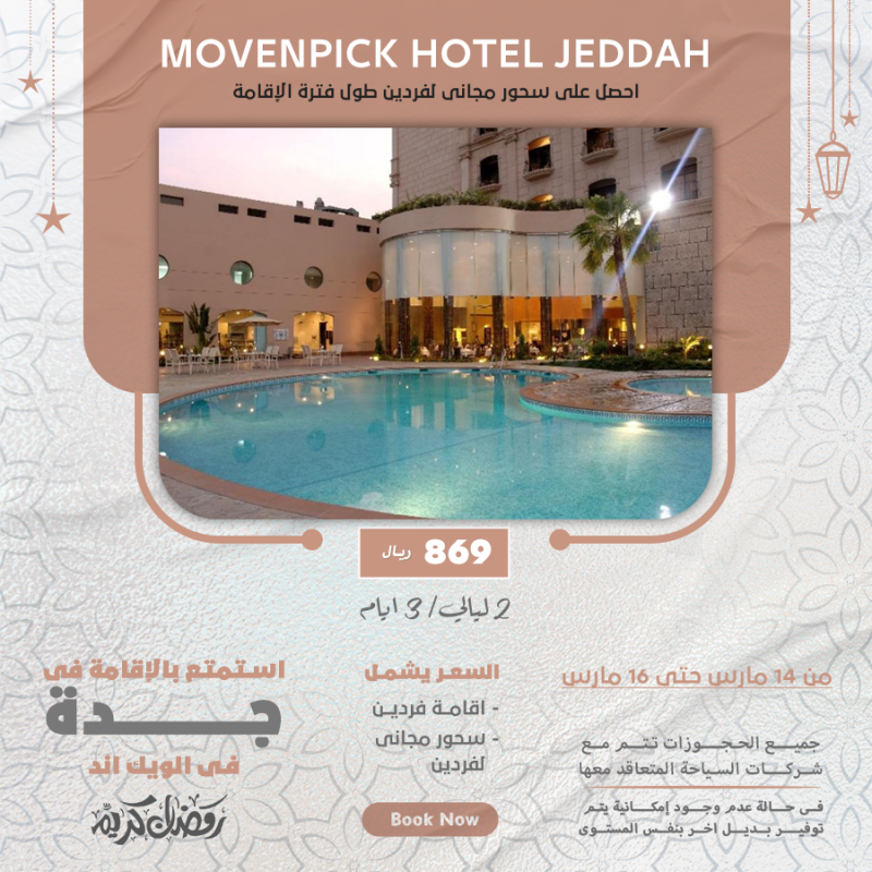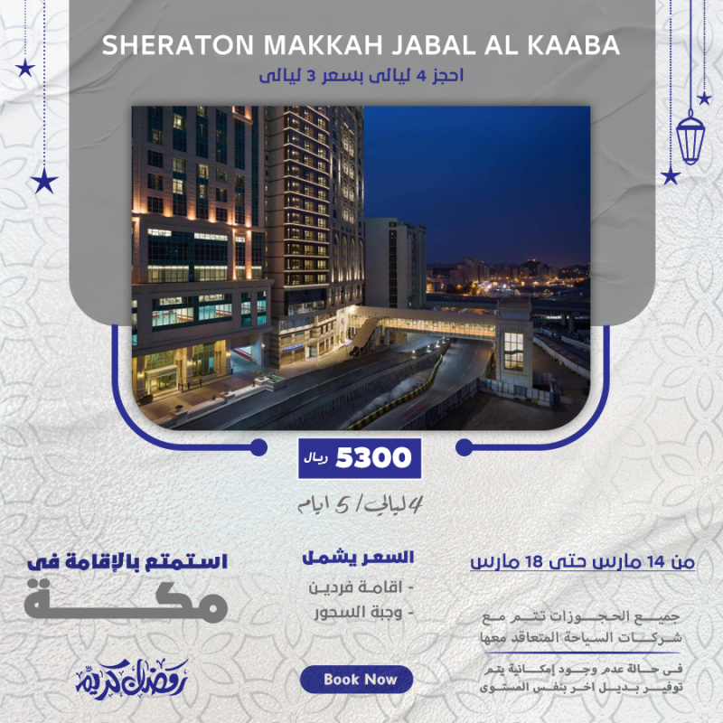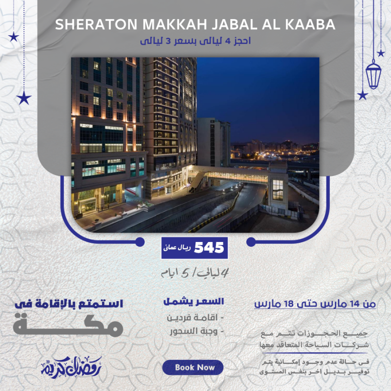 احجز الان واحصل علي 4 ليالي بسعر 3 ليالي السعر يشمل اقامة فردين ليالي5/4أيام سحور رمضان