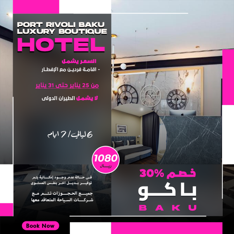 Best SalePORT RIVOLI BAKU LUXURY BOUTIQUE HOTEL ليالي6\7أيام السعر يشمل اقامة فردين مع الافطار من 25 يناير حتي 31 يناير لا يشمل الطيران الدولي